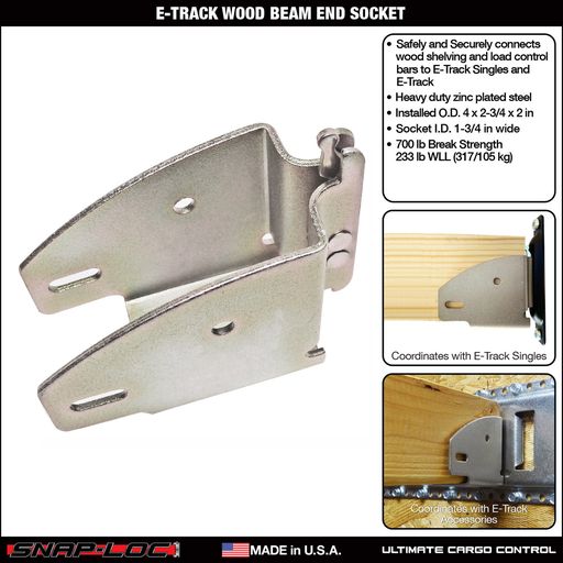 Snap-Loc E-Track Wood Beam End Socket is the easiest, fastest and safest way to connect and disconnect wood stud load beams, shelving and more to Snap-Loc E-Track Singles and E-Track on pickups, trucks, trailers, racks, walls, floors, ceilings and more!